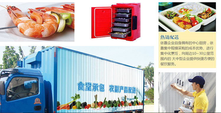 在我公司基地加工成成品,分裝到專門的食品槽、桶中,然后裝入保溫箱中,用專門送餐車輛配送到指定地點(diǎn),服務(wù)人員隨車到達(dá),按客戶要求提供散打、零點(diǎn)、自助等分餐方式。