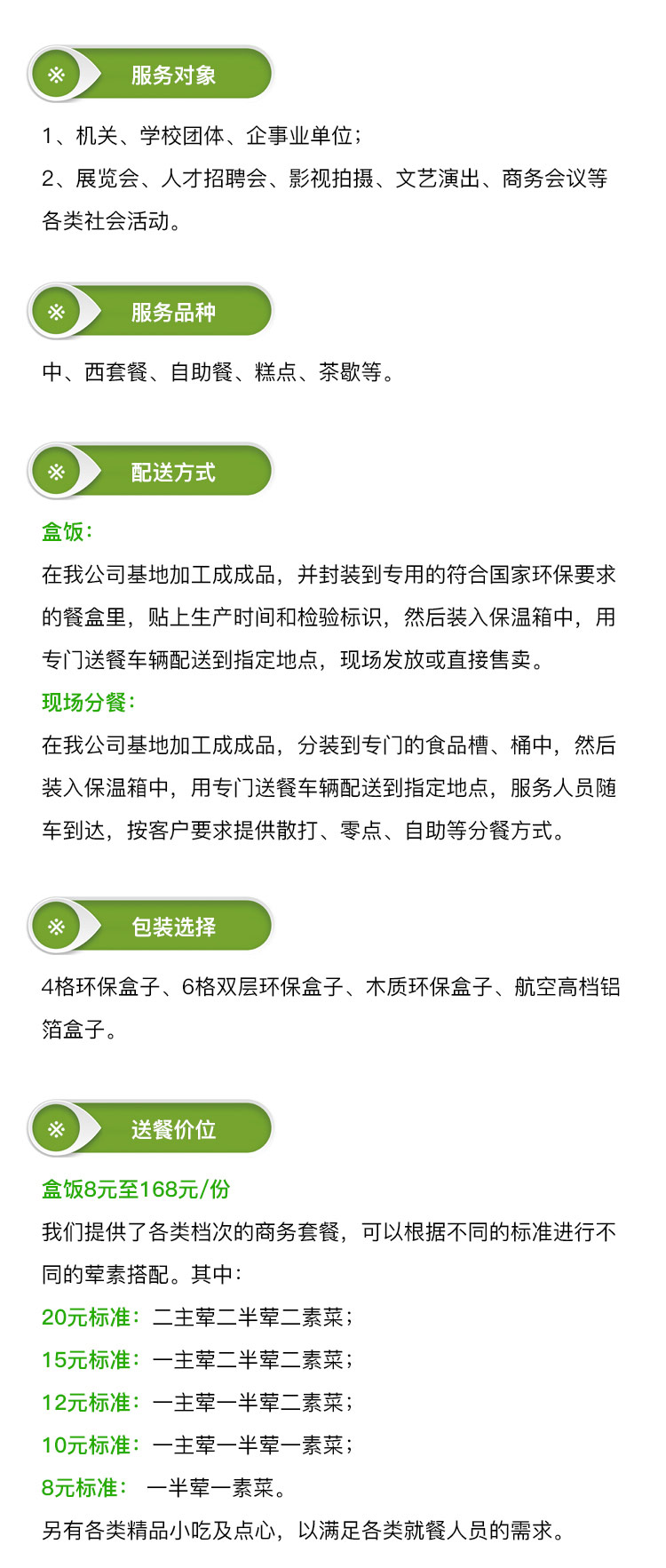 團(tuán)體餐,自助餐等各類(lèi)營(yíng)養(yǎng)配餐。我們可根據(jù)貴司要求提供各類(lèi)檔次的商務(wù)套餐,可以根據(jù)不同的標(biāo)準(zhǔn)進(jìn)行不同的葷素搭配。另有各類(lèi)精品小吃及點(diǎn)心,以滿足各類(lèi)就餐人員的需求。